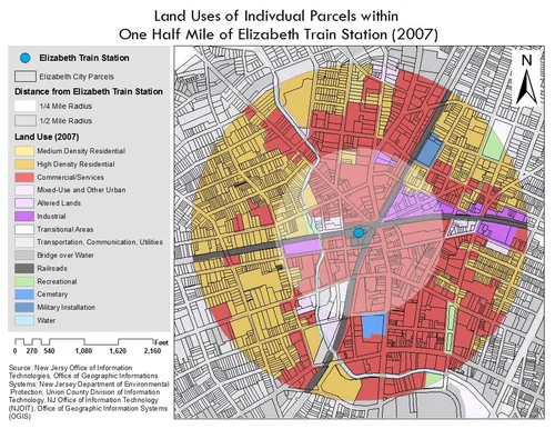 For Introduction to GIS at the Bloustein School, I focused on Elizabeth, NJ as my topic area. The first and second maps visualize the land uses within quarter-mile and half-mile radii of the Elizabeth rail station. The second map includes a table showing the percentage of each land use.